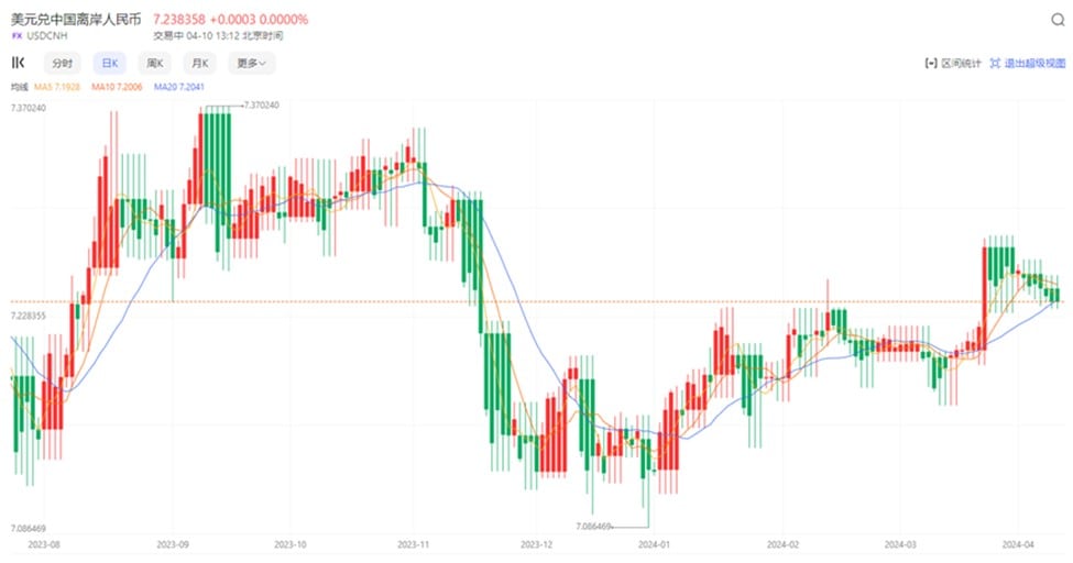 3月中旬以来,人民币兑美元汇率出现较大幅度贬值,并一度创下四个月以来的新低。不过,进入4月后,在岸人民币、离岸人民币兑美元汇率短期波动后企稳回升,当前在7.2-7.25区间弱势震荡。