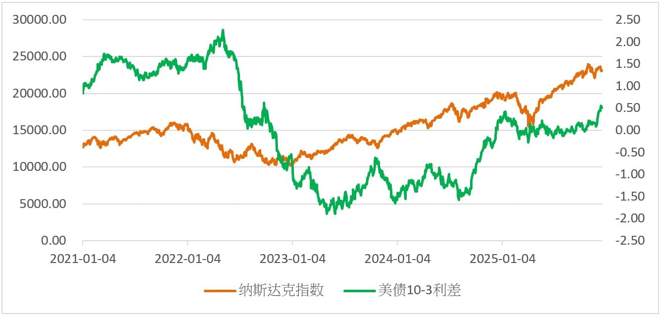 图为美债长短端利差和纳斯达克指数收盘价走势对比