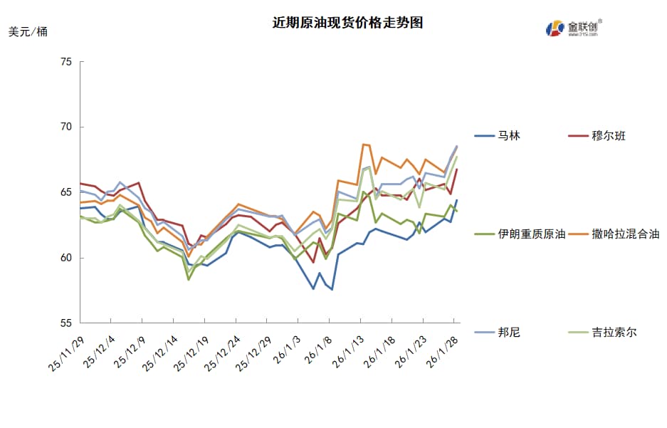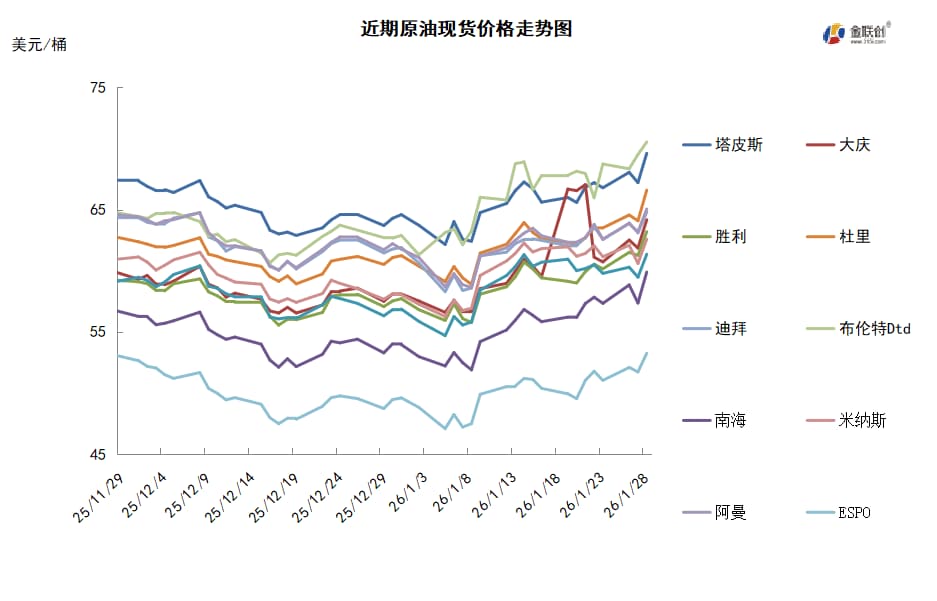 本周,国际原油现货均价环比涨跌不一。中东原油市场方面,3月装中东原油的磋商接近尾声,大部分阿布扎比和卡塔尔原油船货已经售完。但是,部分上扎库姆原油船货还没有找到买家。不过,中东原油市场面受印度买家的需求支撑。3月装卡塔尔埃尔沙欣原油的现货价差反弹至每桶对迪拜贴水0.27-0.32美元,跟随3月装迪拜原油市场走势。日本的终端用户,比如Cosmo Oil和ENEOS购买了埃尔沙欣原油现货。与此同时,两位熟悉内情的消息人士透露,印度石油公司(IOC)已购买了700万桶3月装原油以替代俄罗斯原油,此举标志着印度炼油商正在重新调整策略,逐步减少俄罗斯原油的采购量,并增加中东原油的进口量。这一转变可能有助于印度与美国达成降低关税的贸易协议。消息人士称,印度石油公司已从壳牌公司买入100万桶阿布扎比的穆尔班原油,并从摩科瑞公司购入200万桶上扎库姆原油。此外,该公司还从埃克森美孚公司各购入100万桶安哥拉的Hungo原油和Clove原油。亚太原油现货市场,越南原油方面,越南PV Oil公司出售3月装SV-DN原油的标书结果尚未揭晓。一位东北亚的终端用户表示,由于亚洲市场的石脑油炼制利润正在下降,这批SV-DN原油船货的决标价可能将局限在即期布伦特升水约3.00美元/桶。澳大利亚原油方面,由于新加坡的低硫燃料油利润缺乏上升动力,终端用户对澳大利亚Vincent原油的需求减弱,导致3月装Vincent原油船货的现货估价跌至即期布伦特升水2.00美元/桶。
