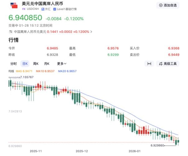2026年开年,人民币汇率市场延续强势行情,人民币中间价、在岸及离岸人民币对美元即期汇率均强势“破7”。其中,1月27日,离岸人民币对美元盘中更是升破6.93。