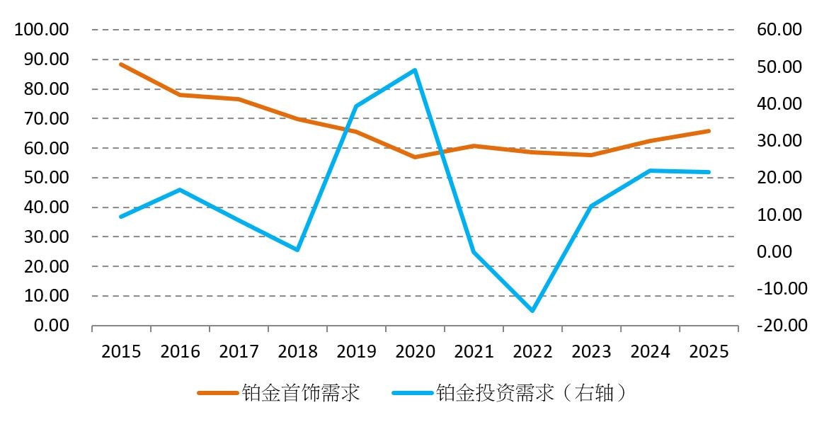 图为铂金的首饰需求和投资需求年度变化(单位:吨)