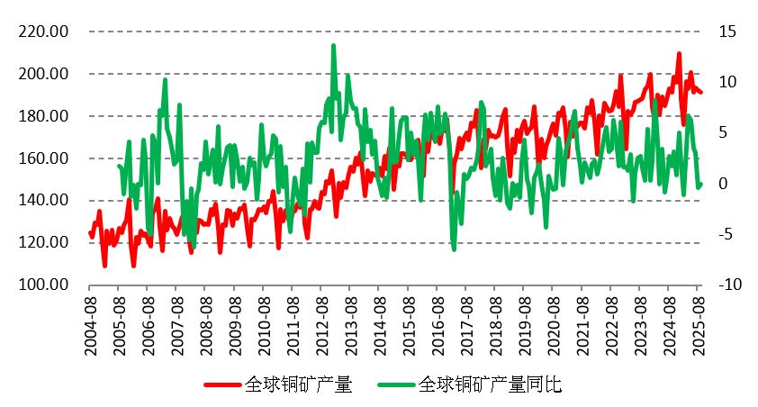 2025年,铜矿供应增量不及预期。国际铜研究组(ICSG)发布的数据显示,2025年8-9月全球铜矿同比出现负增长。根据矿企财报和产量指引推测,2025年全球铜矿产量小幅下降0.12%。其中2025年三季度,前二十大铜矿量同比下降6.5%,多数企业受外部扰动和内部因素影响出现减产,仅部分企业凭借矿区运营优化实现增长,行业分化态势显著。