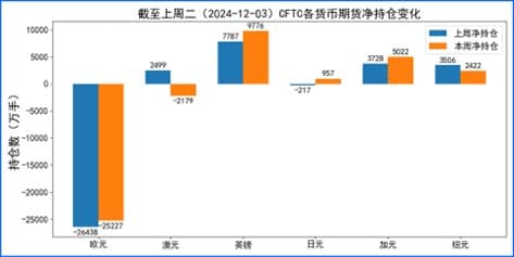 据美国商品期货委员会公布的2024-12-03期货市场头寸持仓报告显示,上周各货币的报告总持仓情况如下:欧元净多头变化1211手,澳元净空头变化4678手,英镑净多头变化1989手,日元净多头变化1174手,加元净多头变化1294手,纽元净空头变化1084手,上周总持仓多空转换的货币有:澳元,日元。除此之外,单向总持仓变动超过20%的货币有:英镑,加元。