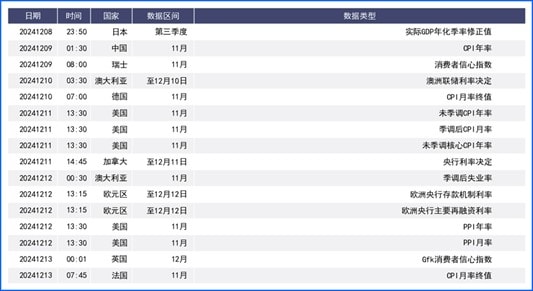 上周五公布的美国11月非农就业人数增加了227,000人,失业率保持在4.2%。该数据显示美国就业市场仍未崩溃,但也并未升温。本周CPI和PPI报告将是政策制定者在12月会议前的最后拼图,助力美联储是否降息的决策。美联储主席鲍威尔最新讲话中提到,当前经济形势使美联储可以采取更加谨慎的政策,暗示美联储可能不会急于降息,但目前市场普遍12月会议上将降息25个基点。