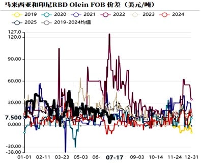 进入6月份后,马来西亚与印尼精炼棕榈油的价差不断缩小,当前二者价差是2019年以来次新低水平,仅高于印尼减产200万吨的2024年,当前马来西亚棕榈油供需宽松程度高于印尼。