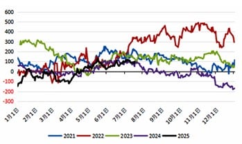 图5:印度港口精炼棕榈油价差(美元/吨)