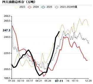 截至7月11日,国内豆油、菜油、葵油和棕榈油总库存达到247.3万吨,处于历史偏高水平。其中,菜油在缓慢去库存,豆油和棕榈油在累库,葵油库存维持历史低位。