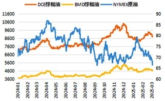 DCE棕榈油、BMD棕榈油及NYMX原油收盘价(元/吨,林吉特/吨,美元/桶)
