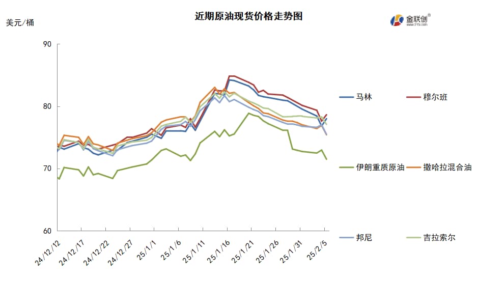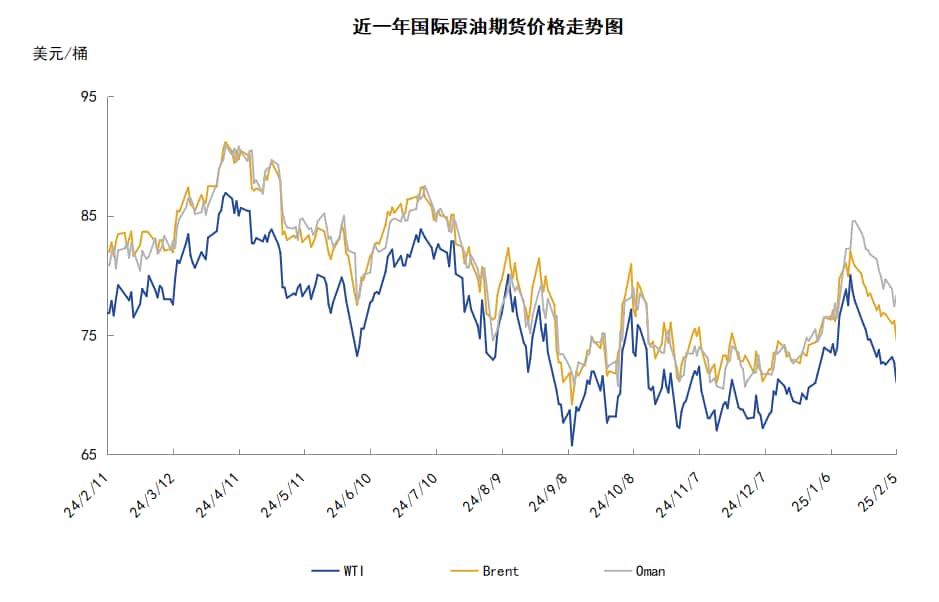 导读:本周期(1.23-2.5),原油整体呈现震荡下行的走势。WTI本期均价73.10美元/桶,较前一期下跌3.87美元/桶,或-5.03%。周内,导致油价承压下跌的因素有:OPEC仍将保持产量政策,原油产量预计将逐渐增加,美国燃料需求预计减少,美国原油与汽油库存增加以及投资者对特朗普政府关税政策的观望情绪。
