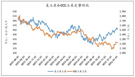 元旦过后,国内外玉米期价延续反弹走势。CBOT玉米期价近期波动区间再度上移,目前已经上破2024年7月份以来的区间上沿。从国内玉米期价来看,明显弱于外盘,不仅反弹时间点明显晚于外盘,同时力度也弱于外盘,近期也呈现区间上移表现。