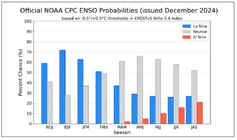 近期,市场对于拉尼娜的关注度再度上升。据巴西气象学家评估,拉尼娜正在形成中。NOAA 2024年12月预计,拉尼娜现象在2024年11月至2025年1月出现的概率为59%,在2025年3月至5月期间过渡到中性的概率为61%。同时,近期监测数据显示,大气状况已经显示出拉尼娜的迹象。在过去 15 到 20 天里,赤道太平洋的表层水进一步冷却。