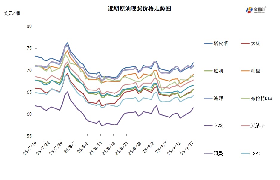 本周,国际原油现货均价环比上涨。中东原油市场方面,沙特对中国的原油供应大幅提高。多位贸易消息人士表示,在大幅下调原油官方售价后,沙特10月份对中国的原油出口量将大幅增加。对中国炼油商的分配记录显示,沙特阿美10月份将向中国运送约5100万桶原油,平均约为165万桶/日。 这高于9月份143万桶/日的计划出口量,但与8月份的出口量相同,8月出口量是自2023年4月以来的最高水平。沙特阿美在本周于新加坡举行的亚太石油大会期间与亚洲买家进行了交流,鼓励他们在10月份增加原油采购量,以夺回市场份额。亚太原油现货市场,CPC混合原油出口稳定。有知情贸易商表示,9月份到目前为止,里海管道财团(CPC)Yuzhnaya Ozereyevka码头的CPC混合原油出口量稳定在每日大约160万桶。9月份的出口量略低于8月份,8月份的出口量为每日166万桶左右,这表明来自哈萨克斯坦Tengiz、Karachaganak和Kashagan油田的供应稳定。CPC管道是哈萨克斯坦原油出口至全球市场的一条主要出口通道,其大部分原油出口到欧洲和亚洲。俄罗斯也供应少部分原油到CPC管道。此外,印度方面表示将继续购买俄罗斯原油。印度财政部长Nirmala Sitharaman上周指出,印度的石油公司将继续购买俄罗斯原油。8月份印度对乌拉尔原油的购买量减少,尽管西方制裁,但印度对乌拉尔原油的需求仍较强劲。9月份俄罗斯原油出口量将较8月份增加200万桶/日,因乌克兰无人机对俄罗斯炼油厂的袭击导致国内原油的需求减少。
