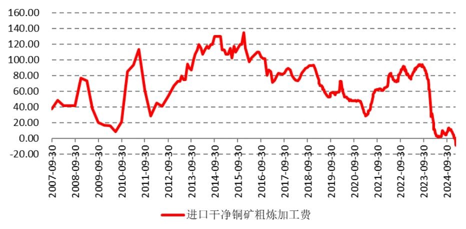 去年年底,中国铜原料联合谈判小组(CSPT)敲定2025年一季度的铜精矿现货采购指导加工费TC/RC为25美元/吨及2.5美分/磅,较2024年一季度的80美元/吨及8美分/磅大幅下降68.8%。与此同时,2025年1月, 进口铜精矿现货加工费跌至负值,直到2月24日还维持-8.6美元/吨及-0.86美分/磅,铜矿供应紧张的情况在加剧。