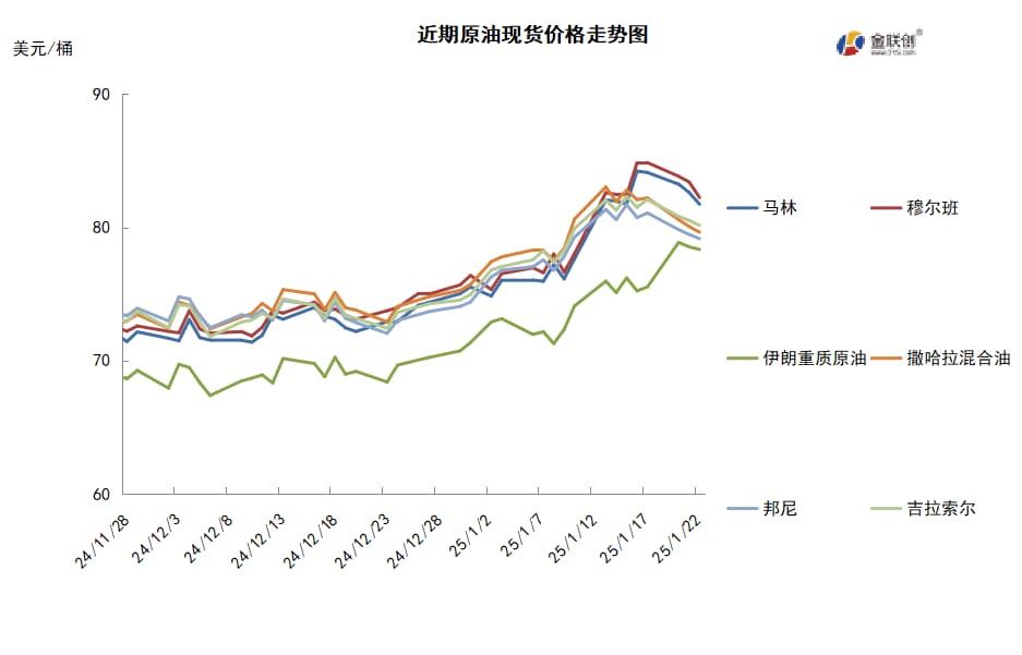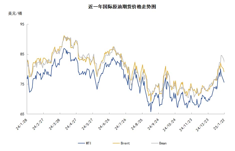 导读:本周(1.16-1.22),原油整体呈现高位回落的走势。WTI本周均价76.97美元/桶,较前一周下跌0.40美元/桶,或-0.51%。周内,导致油价承压下跌的因素有:投资者对美国当选总统特朗普可能出台的最新政策持观望态度,美国原油供应预计增加以及OPEC下调需求增长预期。