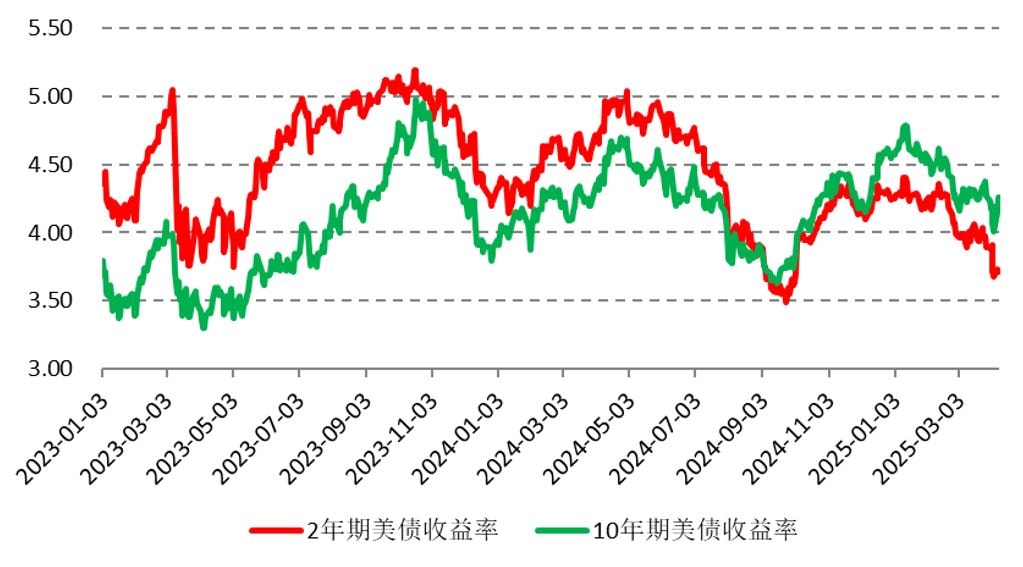 自4月2日,美国公布新一轮大规模加征关税之后,全球金融市场出现剧烈动荡,美股出现暴跌,大宗商品普遍下挫,在避险情绪的驱动下,投资者纷纷转向美债和黄金等避险资产避险,美债价格大幅上涨。截至4月8日, 2年期和10年期美债收益率分别升至3.71%和4.26%,此前一度降至3.89%和4.01%。