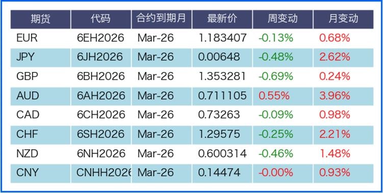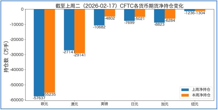 据美国商品期货委员会公布的2026-02-17期货市场头寸持仓报告显示,上周各货币的报告总持仓情况如下:欧元净多头变化2402手,澳元净空头变化2000手,英镑净多头变化5880手,日元净多头变化2678手,加元净多头变化2539手,纽元净空头变化68手,上周没有总持仓多空转换的货币。没有单向总持仓变动超过20%的货币。
