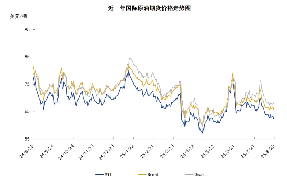 导读:本周(8.14-8.20),国际原油价格整体呈现区间震荡走势,周度均价环比涨跌不一。WTI均价63.15美元/桶,较前一周下跌0.36美元/桶,或-0.57%。周内,导致油价承压的因素有:投资者对地缘局势观望情绪升温,特朗普与普京以及泽连斯基分别举行会晤,美国与OPEC+原油产量增加。