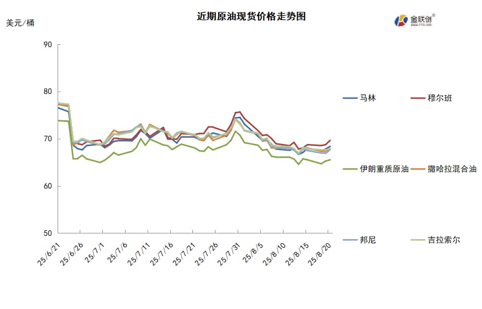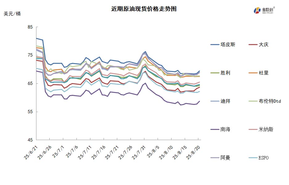 本周,国际原油现货均价环比下跌。中东原油市场方面,迪拜、阿曼和穆尔班等中东基准原油现货升水下滑,因美国总统特朗普与俄罗斯总统普京会晤后,市场对俄罗斯石油供应面临更严厉制裁的担忧有所缓解。因供应紧张情况缓解,市场情绪转弱,伊拉克10月装巴士拉中质原油现货价差下跌。自OPEC+在8月初决定9月份继续增产后,市场认为伊拉克国家石油营销组织(SOMO)已开始向其合约客户增加原油供应量。卡塔尔下调了埃尔沙欣原油的10月合约价。消息人士表示,卡塔尔能源公司将10月装埃尔沙欣原油的合约价较上个月下调0.81美元/桶,至升水迪拜原油2.52美元/桶。消息人士还表示,卡塔尔以升水迪拜原油价格2.30-2.55美元/桶左右的价格售给OQ和日本出光兴产公司各一船埃尔沙欣原油船货。船货数量均为50万桶。此外,数据显示,受管道原油污染问题影响,今年1-7月阿塞拜疆通过巴库-第比利斯-杰伊汉管道出口的原油数量为1620万吨,同比下降5.9%。亚太原油市场交易冷淡,中国商家的沙特原油合约船货购买量下降。几家跟沙特阿美签署了长期合约的中国石油公司9月原油船货的购买量可能低于合约数量。马来西亚国家石油公司(Petronas)表示,从10月份起将对Miri轻质原油推出新的价差。该价差与同月即期布伦特原油价格相加,就形成了该原油的官方售价。该公司还表示,尽管有所变化,但Miri轻质原油仍将是马来西亚一揽子原油(MCO)的一部分。该一揽子原油决定着MCO的原油官方售价。