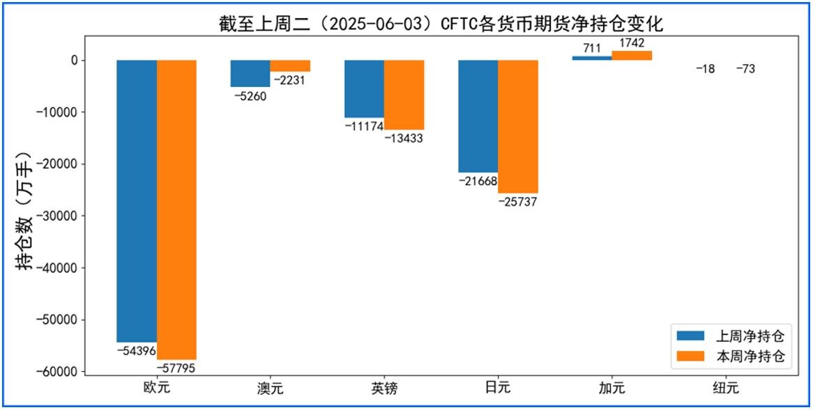 据美国商品期货委员会公布的2025-06-03期货市场头寸持仓报告显示,上周各货币的报告总持仓情况如下:欧元净空头变化3399手,澳元净多头变化3029手,英镑净空头变化2259手,日元净空头变化4069手,加元净多头变化1031手,纽元净空头变化55手,上周没有总持仓多空转换的货币。除此之外,单向总持仓变动超过20%的货币有:英镑,加元,纽元。
