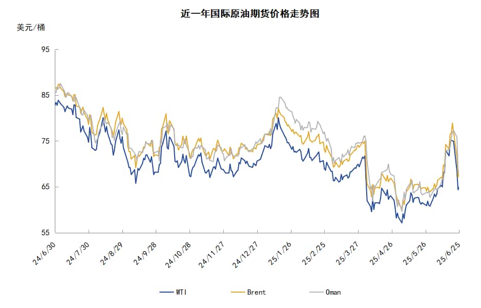 导读:本周(6.19-6.25),国际原油价格整体呈现高位回落的走势。WTI均价68.18美元/桶,较前一周下跌4.37美元/桶,或-6.03%。周内,导致油价承压的因素有:伊以达成停火协议,中东地缘局势快速缓和,市场对霍尔木兹海峡可能被封锁的担忧大为缓解。