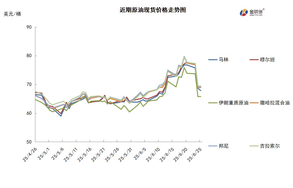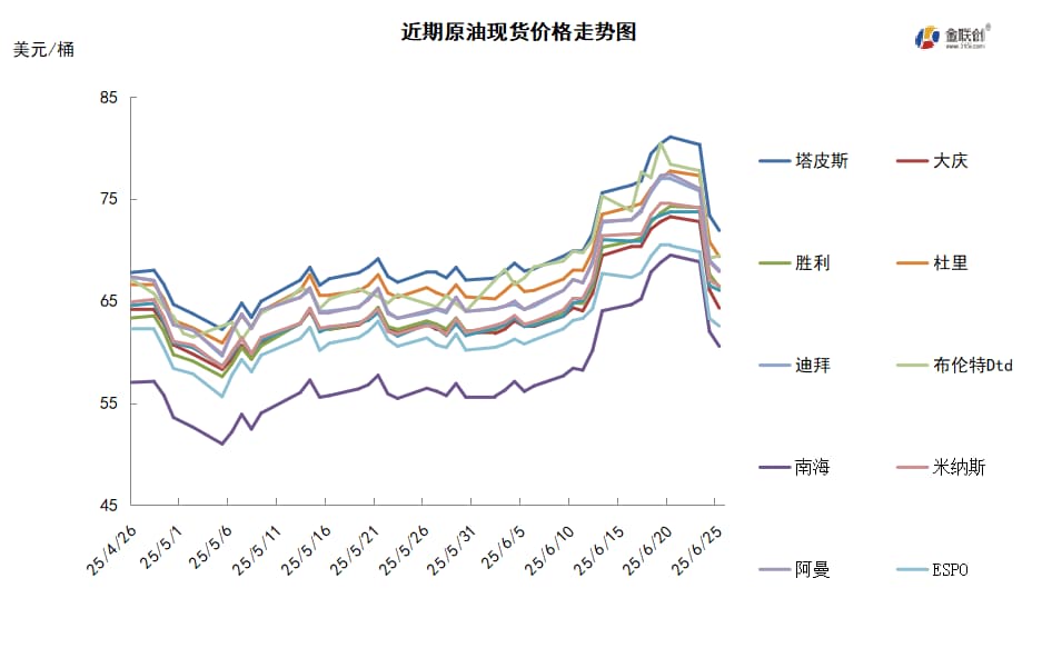 本周,国际原油现货均价环比上涨。中东原油市场,市场交投清淡,由于中东紧张局势引发的供应担忧在一定程度上得到缓解,中东基准迪拜和阿曼等原油现货升水继续下跌。在美国总统特朗普促成伊朗与以色列达成停火协议之后,双方似乎维持了停火状态,但不确定性仍令市场参与者持观望态度。此外,特朗普表示,在以色列与伊朗达成停火协议后,中国可以继续购买伊朗石油,但白宫澄清称,此举并不意味着美国将放松对伊制裁。卡塔尔8月装Al Shaheen原油价格下跌,目前嘉能可公司至少有三船8月装Al Shaheen原油船货待售。官方数据显示,预计4月份沙特的原油出口攀升至616.6万桶/日,高于3月份的575.4万桶/日。4月份,沙特的原油产量从3月份的895.7万桶/日增长至900.5万桶/日。此外,数据显示,哈萨克斯坦6月份的石油和天然气凝析油日产量预计将为28.5万吨(约214万桶),较5月的26.9万吨增长6%。哈萨克斯坦的产量经常超出由OPEC+设定的产量配额,这引发了其他成员国的批评。哈萨克斯坦能源部表示,6月份前10天的石油和凝析油日均产量为28.5万吨,如果没有任何意外情况发生,这一产量水平将保持不变。亚太原油市场,马来西亚Petronas国家石油公司招标销售8月装Muda和Cakerawala凝析油船货,泰国PTT公司可能购得其中一批船货,但细节不详。目前泰国等东南亚终端用户更热衷于购买马来西亚凝析油船货,因运输距离比中东或其他地区更短。随着以色列和伊朗之间的冲突升级,全球运费已经大涨。