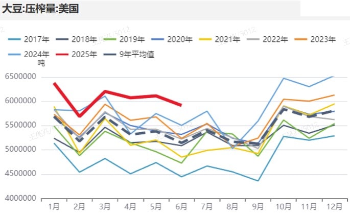 6月中上旬,美国环境保护署(EPA)提议将2026年和2027年生物质柴油BBD掺混义务分别上调至56.1亿加仑和58.6亿加仑,高于此前市场预期的46.5亿加仑和52.5亿加仑。如果按照提议实施,美豆将新增压榨消费近1000万吨。该提议公布前后,CBOT豆油涨幅超过15%。