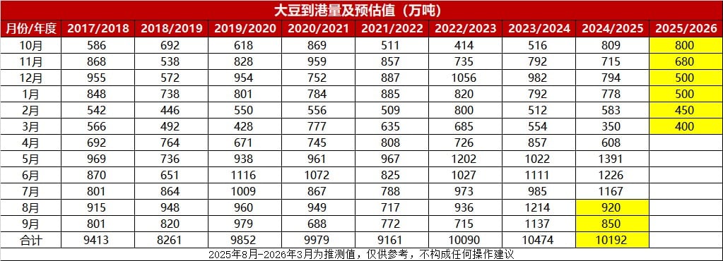 “弱现实”主要表现为5~9月份中国大豆月均进口到港量较大,预估5~8月份大豆月均压榨量近1000万吨。高到港量和高压榨量使得中国榨油豆、豆粕、豆油库存连续积累,豆类市场“弱现实”尽显。