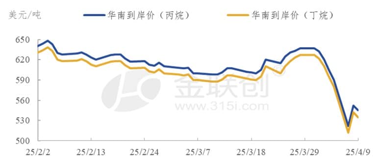 因关税政策的不断演变,国际液化气市场行情开始了剧烈波动。截止至4月9日的一周内,到岸华南冷冻货丙烷周平均价格较上期跌69美元/吨或10.92%至562.8美元/吨,丁烷周平均价格跌69美元/吨或11.1%至552.8美元/吨。中东冷冻货离岸丙烷周平均价格较上期跌30.8美元/吨或5.16%至566.6美元/吨,丁烷周平均价格较上期跌30.8美元/吨或5.24%至556.6美元/吨。