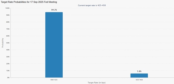 图1: 截至8月13日, 芝商所FedWatch工具显示,交易员预测美联储9月份降息可能性为94.2%