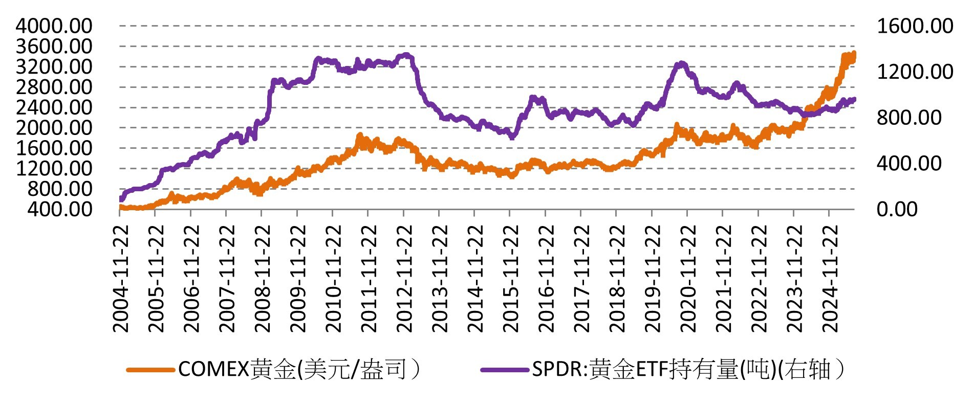 图2: 黄金ETF——SPDR持仓量和COMEX金价变动对比