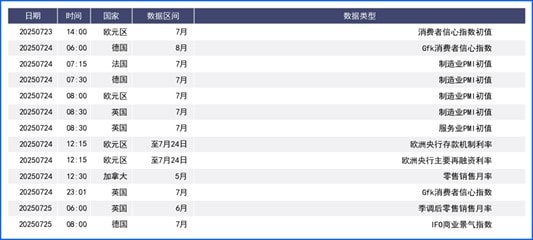 距特朗普8月1日对欧盟进口商品加征30%关税仅剩不到两周,欧盟正努力争取达成贸易协议。欧盟谈判策略的一个关键要素是提议对汽车实施对等关税削减。即降低对美国汽车出口10%的关税,但需特朗普将对欧洲汽车关税降至20%以下。同时本周欧洲央行将公布政策会议,市场目前预期将维持利率不变,但9月可能再次降息,关税的经济影响及美欧贸易谈判的结果届时也将更明朗。