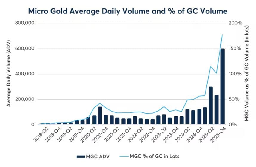 考虑到黄金衍生品的交易门槛过高,投资者可以关注并配置芝商所的微型黄金期货,该合约专为对较小黄金增量感兴趣的交易者而设计的,还可作为基准黄金期货合约的补充。微型黄金期货规模仅为基准黄金期货合约的 1/10,提供交易透明度、价格发现和较小的保证金要求。2025年,微型黄金期货日均交易量 (ADV) 达到 475,825 份合约(看图2),创下历史第二高的月度记录。