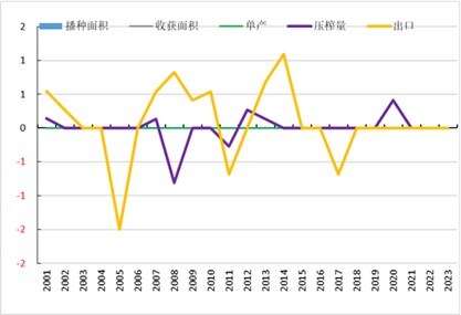 图1:2001~2023年USDA12月报告单产、播种面积、收获面积、压榨量和出口调整情况(吨/英亩、百万英亩、百万吨)