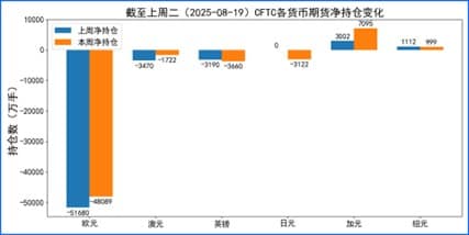 据美国商品期货委员会公布的2025-08-19期货市场头寸持仓报告显示,上周各货币的报告总持仓情况如下:欧元净多头变化3591手,澳元净多头变化1748手,英镑净空头变化470手,日元净空头变化3122手,加元净多头变化4093手,纽元净空头变化113手,上周总持仓多空转换的货币有:日元。除此之外,单向总持仓变动超过20%的货币有:加元。
