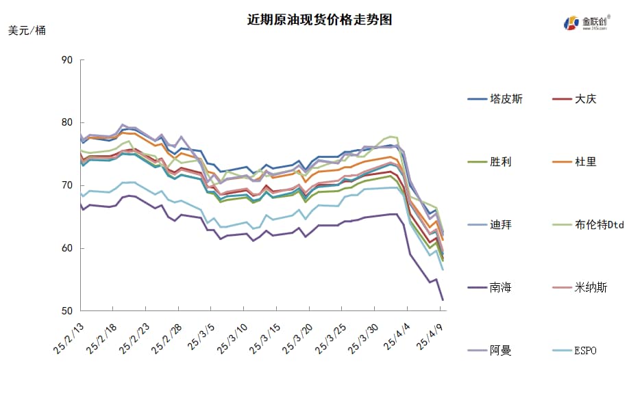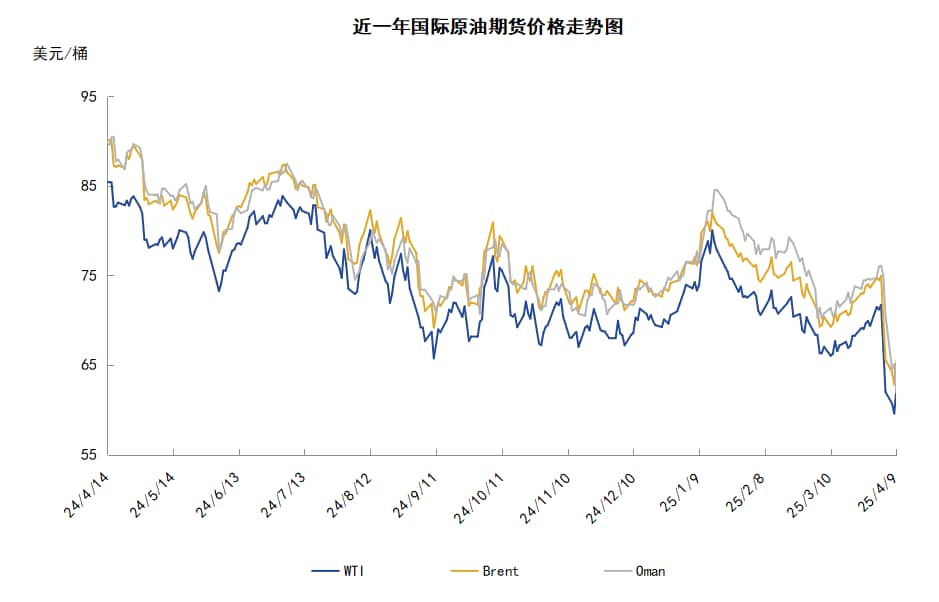 导读:本周(4.3-4.9),原油整体呈现下行的走势。WTI均价62.31美元/桶,较前一周下跌8.42美元/桶,或-11.90%。周内,导致油价承压的因素有:OPEC+增加增产幅度、美国关税政策以及投资者对经济前景的担忧。对油价起到支撑作用的因素有:技术面的反弹需求。