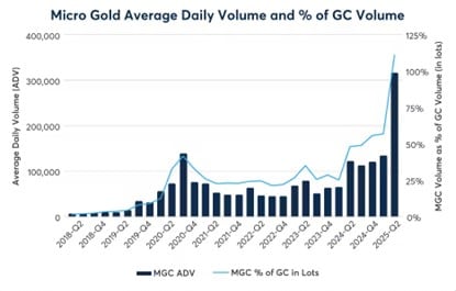 数据显示,随着金价在高位保持稳定,微型黄金(产品代码:MGC)期货连续第二个月创下月平均日交易量(ADV)最高纪录,日交易量为346,607份合约,较之前的纪录增长21%。
