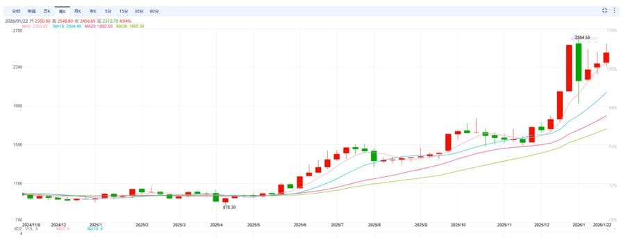 2025年,NYMEX铂期货价格年涨幅高达127%,年末收于2070美元/盎司;2026年初,这一涨势持续发酵,现货价格快速突破2500美元/盎司,实现了贵金属市场的“逆袭”。相较于黄金的避险属性与钯金的汽车催化需求,铂金本轮上涨构建了“供需缺口+库存紧张+新兴需求+宏观宽松”的多重逻辑支撑,其价值重估过程具有鲜明的结构性特征。