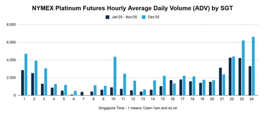 2025年,芝商所铂金期货市场已呈现出前所未有的活跃度。当年创下了近3.8万份合约的日均成交量(ADV)年度最高纪录,并且其历史成交量排名前十五的交易日全部出现在2025年5月、6月和9月。进入2026年初,这一势头不减,数据显示其日均成交量(ADV)以近3.9万份合约的年内新高收官,日均未平仓合约量(ADOI)也达到了近8.6万份合约的历史新高。这反映出在市场分歧与高波动预期下,全球投资者正积极利用这一工具进行风险管理与布局。