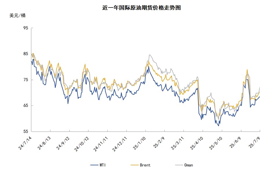 但另一方面,消息面的部分利空因素拖累油价走势。7月5日,以沙特为首的OPEC+八个成员国表示,将把8月份的日产量提高54.8万桶,原油供应增加的预期导致油价承压。此外,EIA(美国能源信息署)下调美国原油产量预期但上调全球原油产量预期。EIA预计,预计2025年美国石油产量为1337万桶/日,低于上月预测的1342万桶/日,但与此同时,EIA预计2025年全球石油产量为1.046亿桶/日,高于此前预测为1.044亿桶/日。经济方面,美国关税政策的90天暂停期于7月9日结束,美国财长贝森特警告美国的贸易伙伴不要延长贸易谈判,如果没有取得进展,关税可能会回升到4月2日的水平,美国加征关税将对经济和燃料需求造成影响的预期也导致市场担忧情绪升温。