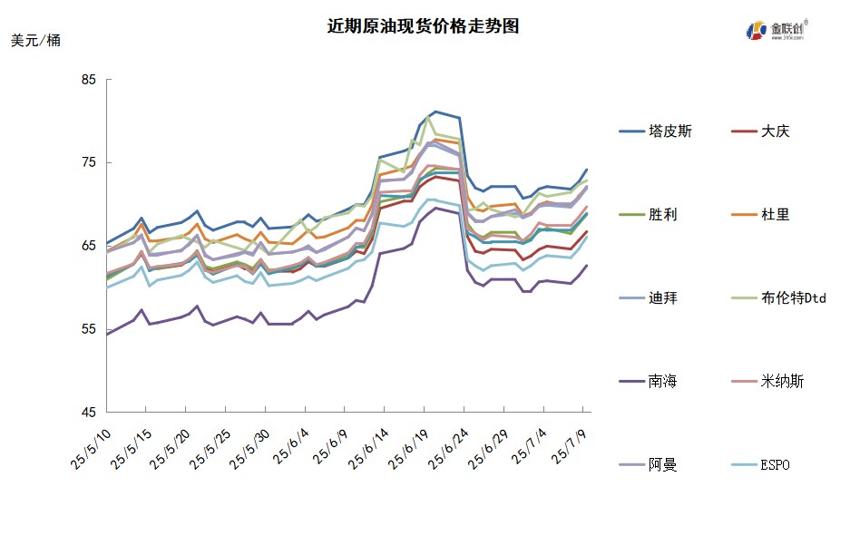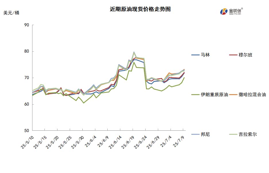 本周,国际原油现货均价环比上涨。中东原油市场方面,官方售价方面,沙特阿美石油公司的价格文件显示,沙特已经将8月份销售到亚洲的阿拉伯轻质原油的官方售价较7月份上调了1.00美元/桶,至阿曼/迪拜均价升水2.20美元/桶,为四个月来的最高水平。价格文件显示,沙特确定8月份销售到西北欧的阿拉伯轻质原油的官方售价为ICE布伦特升水4.65美元/桶,8月份销售到美国的阿拉伯轻质原油的官方售价为ASCI升水3.90美元/桶。此前市场机构数据显示,6月份沙特的原油出口量攀升45万桶/日至633万桶/日,7月份可能进一步攀升至近750万桶/日水平。此外,多位贸易消息人士表示,阿布扎比国家石油公司(ADNOC)在大幅削减供应后,已于7月份恢复了向股东供应大部分穆尔班原油的业务。消息人士称,在上个月的以色列与伊朗冲突期间,ADNOC公司通知股东,其计划将7月份对他们的穆尔班原油供应量削减300-400万桶。亚太原油市场,委内瑞拉对中国的原油和成品油出口量增加。航运数据显示,委内瑞拉6月份的原油和成品油出口量约为84.4万桶/日,较5月增长8%,因为运往中国的货物增加,抵消了在美国和欧洲市场的损失。另外,一位日本能源消息人士表示,9月装越南原油的供应可能有限,这将在一定程度上支撑9月装原油的议价水平。越南PV Oil公司发布标书出售两船9月装黑狮子原油船货,该标书将于8日截标。另外,越南PV Oil公司计划在不久的将来发布标书出售9月装SV-DN原油船货。