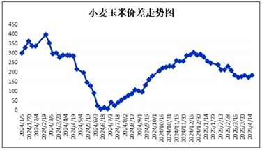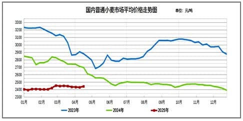 2025年3月至4月,中国主产区普麦收购价格呈现窄幅震荡趋势。截至4月21日,主产区普麦收购均价为2442元/吨,较上年同期的2696元/吨下跌254元/吨;全国普麦收购价格区间在2400~2470元/吨。