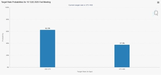 根据芝加哥商品交易所的美联储观察工具显示:美联储到12月维持当前利率不变的概率为37.5%,累计降息25个基点的概率为62.5%。