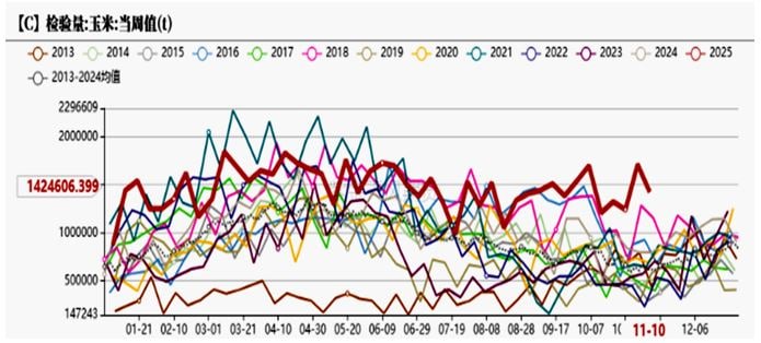 截至2025年11月7日,北方四港玉米库存共计107.1万吨,处于近几年同期次新低位置。但是北粮南运的发货量处于高位,造成阶段性的供小于求。