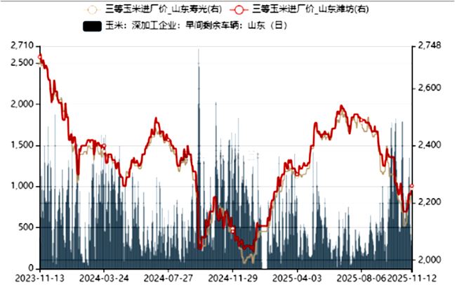 11月13日,山东深加工企业到车323辆,到车数量从11月初开始逐步减少。另外,储备入市收购也支撑玉米现货价格。