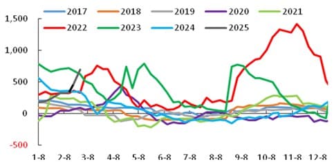 截至2月3日当周,巴西大豆发运50.7万吨,高于前一周的29.5万吨,接近历年平均水平,低于2024年同期的64.4万吨。截至2月7日,巴西大豆收割率为17%,较前一周提高7%左右,中西部雨量较之前减少,收割有望继续加快。但是,近月大豆到港改善的时间和空间有限,目前市场大多认为,4月底之后国内大豆到港才会多一些。