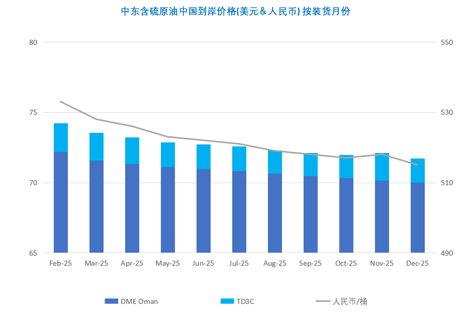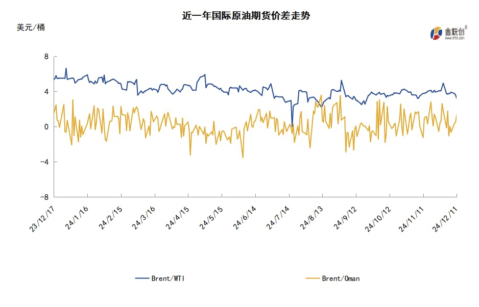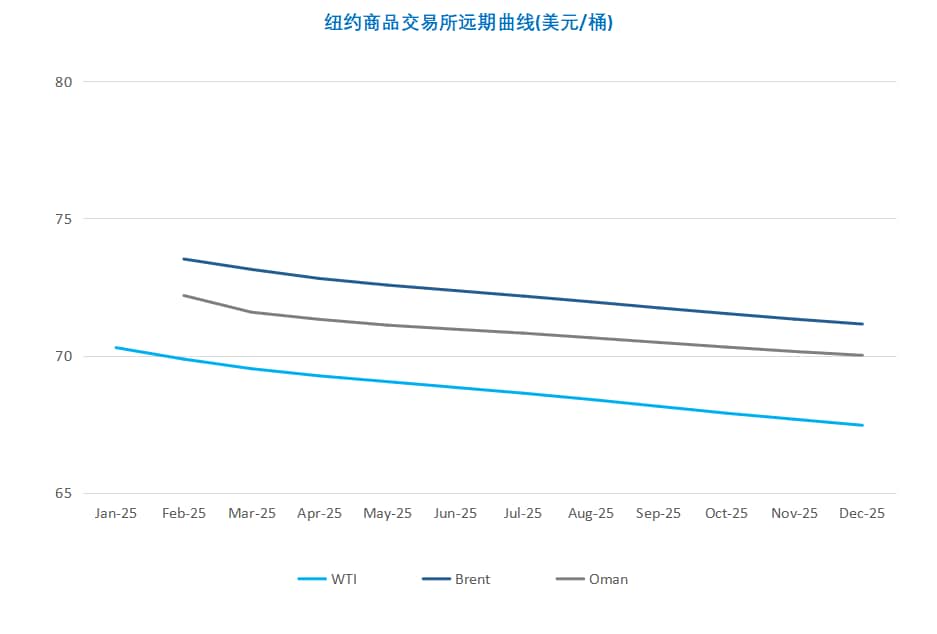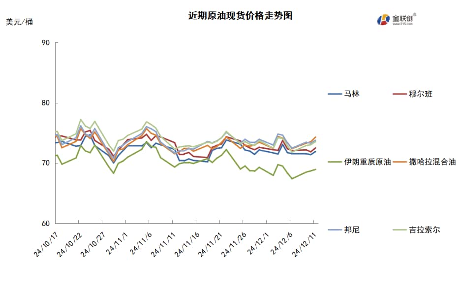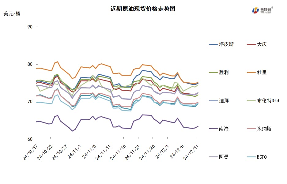 本周,国际原油现货均价环比下跌。中东原油市场方面,在OPEC+会议上决定推迟增产计划并将减产延长至2026年年底后,受整体需求疲弱以及市场担忧供应过剩影响,中东原油现货价格仍下行。预计卡塔尔2025年2月装Al Shaheen原油供应量为16-17船,较1月装船货供应量减少1-2船。卡塔尔能源公司可能将开始招标销售2月装Al Shaheen原油船货。卡塔尔2月装脱臭凝析油升水下跌,市场人气下降。商家密切关注2月装脱臭凝析油供应情况。因油田检修,卡塔尔能源公司最近几个月未销售脱臭凝析油。此外,因为Umm Lulu原油的供应量相对有限,部分商家对Umm Lulu原油的需求坚挺,并且提前采购2月装船货。亚太原油市场,1月装马来西亚拉布安原油的现货价差下跌,因为需求减少,其交易价可能在每桶对即期布伦特升水5美元高段位。由于柴油等中质馏份油裂解价差下跌,大部分终端用户将拉布安等马来西亚原油的估值下调。2月装马来西亚原油船货的磋商下周开始,预计2月装马来西亚原油市场面可能疲软,因购买兴趣冷淡。马来西亚国家石油公司额外销售一船拉布安原油,买家为壳牌,价格为每桶对即期布伦特升水5美元低段位。