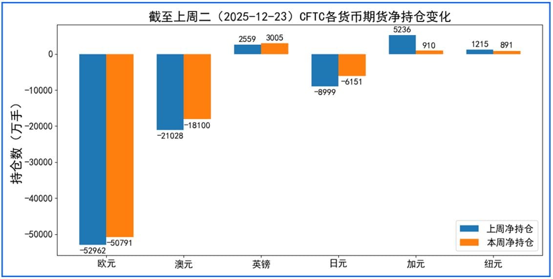 据美国商品期货委员会公布的2025-12-23期货市场头寸持仓报告显示,上周各货币的报告总持仓情况如下:欧元净多头变化2171手,澳元净多头变化2928手,英镑净多头变化446手,日元净多头变化2848手,加元净空头变化4326手,纽元净空头变化324手,上周没有总持仓多空转换的货币。没有单向总持仓变动超过20%的货币。