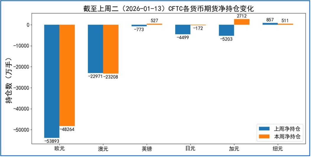 据美国商品期货委员会公布的2026-01-13期货市场头寸持仓报告显示,上周各货币的报告总持仓情况如下:欧元净多头变化5629手,澳元净空头变化237手,英镑净多头变化1300手,日元净多头变化4327手,加元净多头变化7915手,纽元净空头变化346手,上周总持仓多空转换的货币有:英镑,加元。没有单向总持仓变动超过20%的货币。