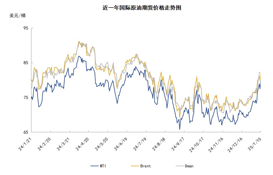 技术图上,WTI原油期货价格在当周持续冲高,自2024年8月份以来首次突破80美元/桶。当周提振油价的主要因素:一是美国对俄罗斯更广泛的制裁可能导致原油供应减少;二是欧美大部分地区天气寒冷;三是美国原油库存连续八周下降。当周打压油价的主要因素:一是EIA和IEA预计今年全球石油市场供过于求;二是加沙停火协议达成。截至15日,WTI报收80.04美元/桶,环比上涨6.73美元/桶或9.18%;截至15日当周,WTI的周均价为77.37美元/桶,环比上涨3.73美元/桶或5.06%。从技术形态上来看,油价看涨为主。