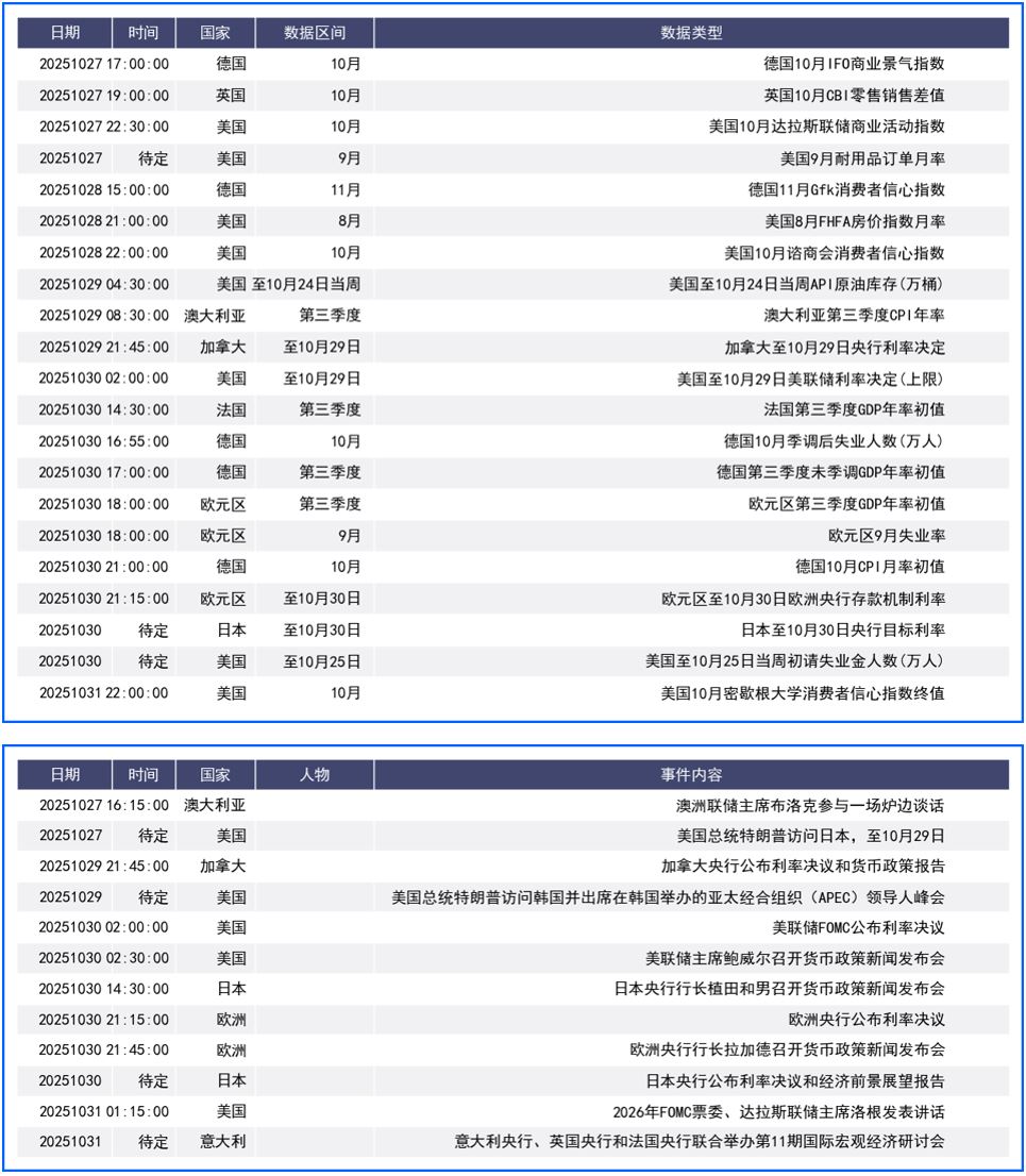 摘要:回顾上周,美元指数和大部分非美货币均维持窄幅震荡,展现出在本周美联储利率决议公布前的交投谨慎氛围。展望本周,美联储、欧央行、日央行同日公布利率决议,APEC峰会聚焦亚太合作新路径。与此同时,美国政府停摆导致的核心通胀数据发布悬念,数据真空与政策博弈的交织很可能加大市场波动。